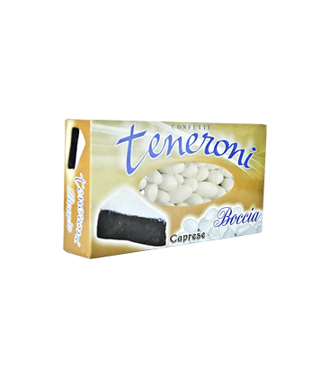 Confetti con mandorla tostata ricoperta di cioccolata al gusto della torta caprese, avvolti da un sottile strato di zucchero.